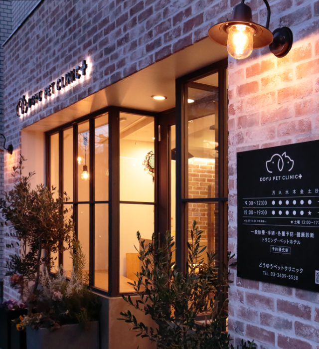 『どうゆう』=『動友』=『DOYU』「動物たちの友」 として「いつも動物の⽴場にたった医療を⼼がけたい」との想いがこめられています。